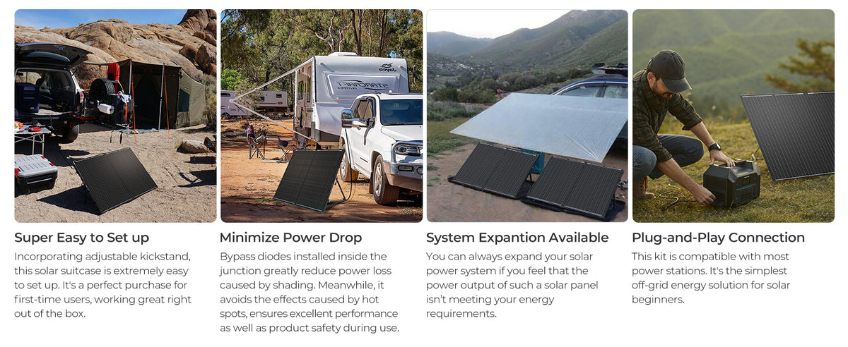 Adjustable kickstands are easy to set up and allow the panels to get maximum sunshine with only minor changes in angles. This ensures you always have enough energy even during emergencies. Take your outdoor adventures to another level with this flexible solution.