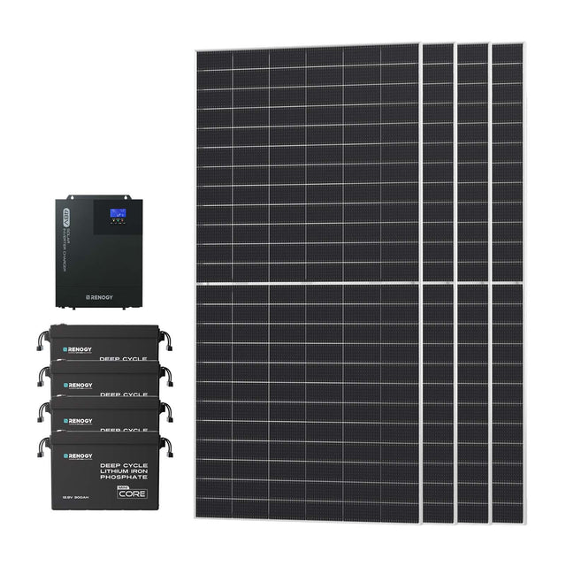 Each kit includes the major components only: solar panels, batteries, an inverter and a charge controller. It does not include accessories like cables, fuses, or mounting brackets unless explicitly listed.