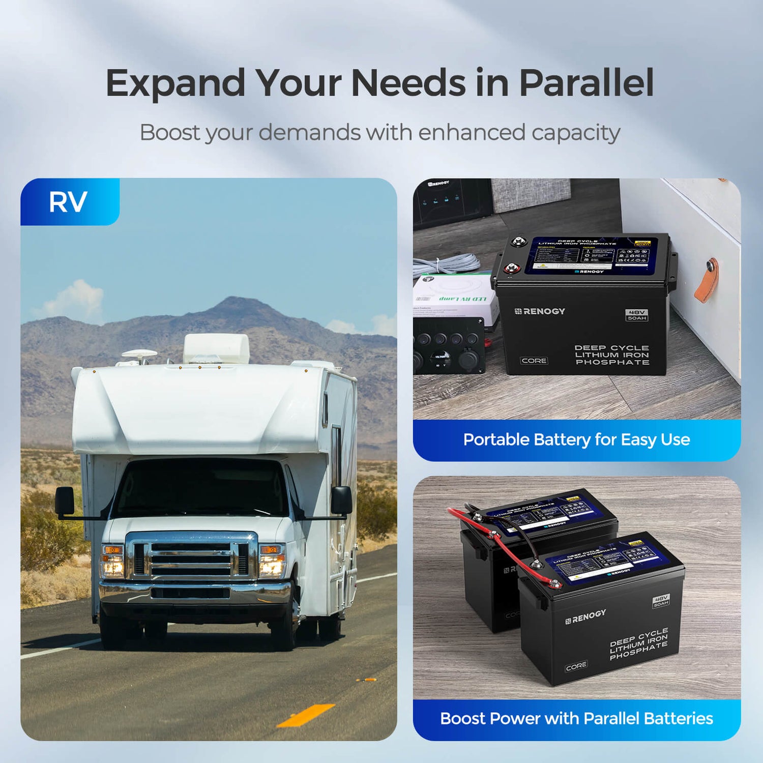 You can connect up to 8 Renogy 48V lithium-ion batteries in parallel. The built-in auto-balancing function ensures that connecting multiple batteries in parallel is safe and efficient, enhancing overall system stability.