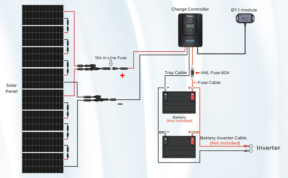 A solar panel has to be connected to a charge controller to regulate current, and a battery to store the electrical power. You will need adapter kit cables to wire the solar panel(s) and charge controller, and tray cables connecting the charge controller to a deep-cycle battery.
