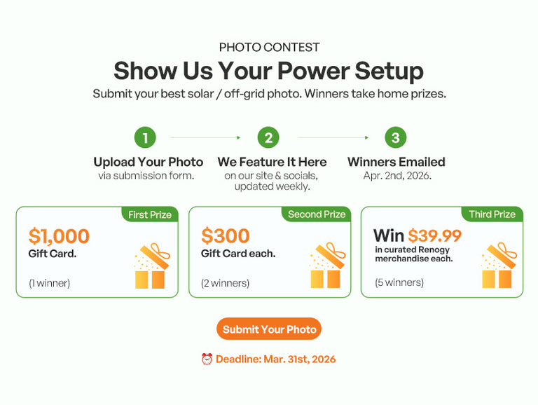 - Terms and Conditions: Renogy reserves the final right of interpretation for all terms and outcomes of this event. In cases of malicious activities (including but not limited to subscription fraud, order fraud, identity fraud, etc.), Renogy reserves the right to modify or cancel event terms, terminate transactions, recover losses, and revoke the winner's eligibility and right to use the prizes.