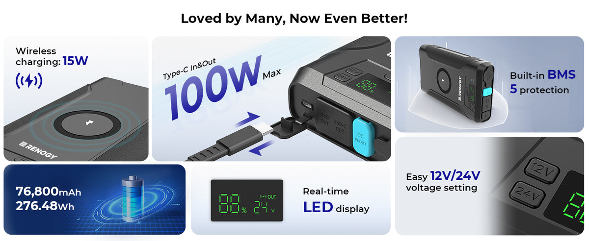 • 【6 Device Charging Ports】2025 Upgraded Renogy 76,800mAh /276.48Wh power bank supports CPAP, laptops, drones & more, with upgraded 100W USB-C PD, a car socket for air pumps/GPS/portable fridges, plus 15W wireless charging. Power up to 6 devices—perfect for camping, outdoor adventures, and emergency backup (*Not TSA-approved for air travel).