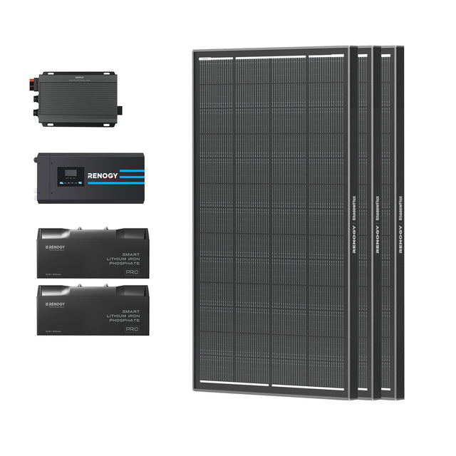Each kit includes the major components only: solar panels, batteries, an inverter and a charge controller. It does not include accessories like cables, fuses, or mounting brackets unless explicitly listed.