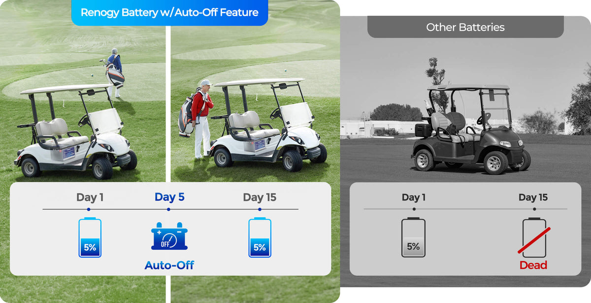 The last thing you want is a fully drained battery waiting in your golf cart when you leave for days or months. The smart Auto-Off feature kicks in after 5 days of inactivity, ensuring your battery stays healthy and ready even if you forget to turn it off manually.