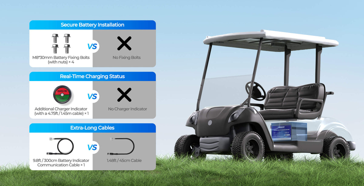The corrosion-resistant metal casing keeps dirt and water out, while the 220A BMS is always on duty: balancing cells, preventing overloads, monitoring temperatures, and keeping your cart rolling smoothly.