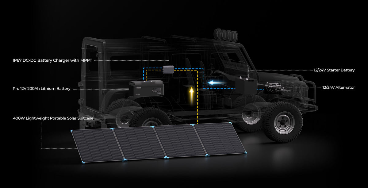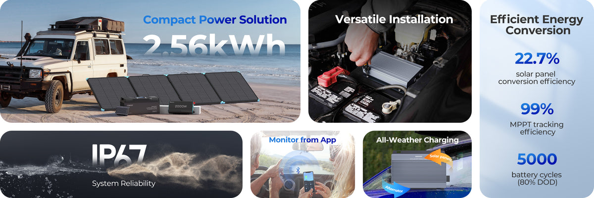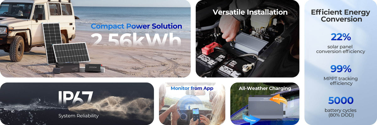 Maximize your power freedom in compact off-road camping spaces with our Conqueror Kit. Featuring fixed rooftop solar panels, it offers a dual charging solution, allowing your house battery to be charged by both the solar panels and the vehicle's starter battery simultaneously while you're on the move.