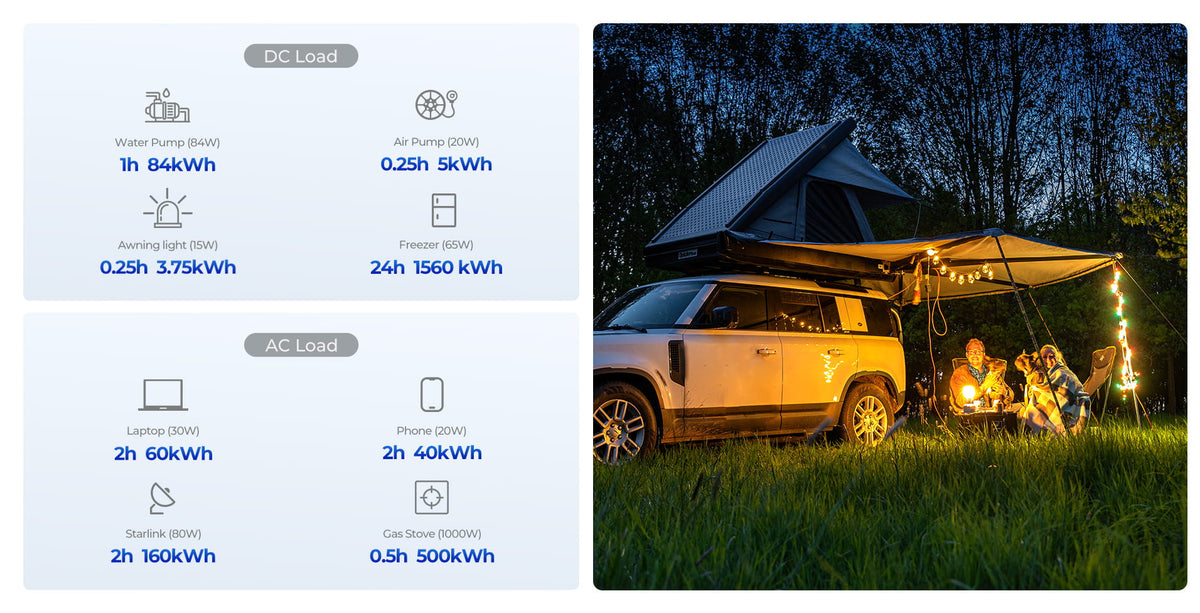 Maximize your power freedom in limited Off-road camping spaces with our adventurer kit, featuring an inverter to seamlessly support both DC and AC power needs.
