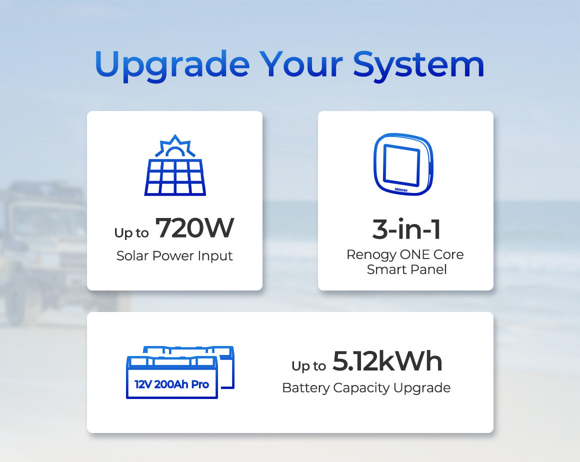 The solar panel upgrades deliver up to 720W of solar power, providing ample energy for your adventures. The Renogy ONE Core Smart Panel simplifies monitoring and control, offering real-time data and effortless system management. Expand your capacity with an additional Pro 12V Battery, capable of handling up to 5.12kWh in total.