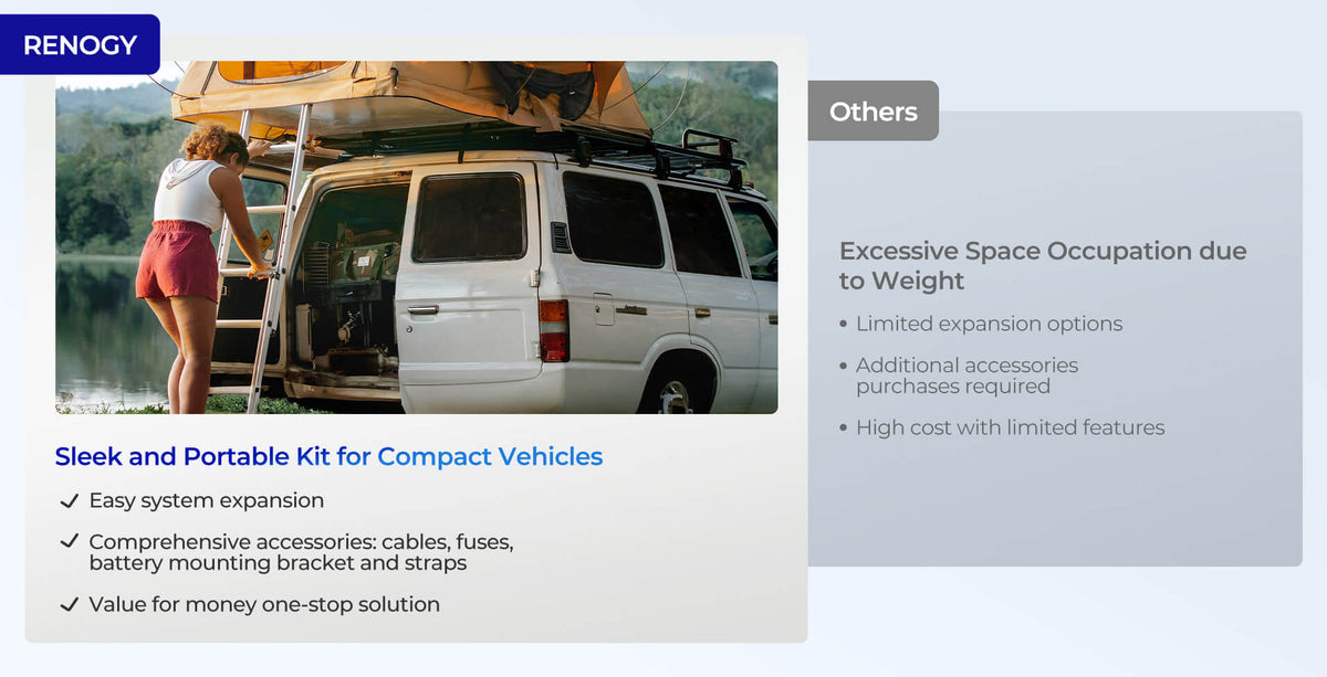 Renogy Off-road Pioneer Kit keeps both your DC and AC appliances running smoothly, enriching your outdoor experience. Prioritizing comfort, convenience, safety, and smart control, this kit provides a constant and reliable power source, allowing you to venture deep into the wild.