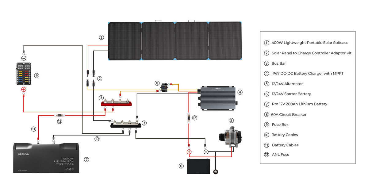 Renogy demonstrates adaptability with the portable solar panel, which is easily deployable and conveniently foldable for storage, maximizing space efficiency. The battery charger can be installed beneath the seats, in the trunk, or within the engine compartment, enhancing system flexibility.