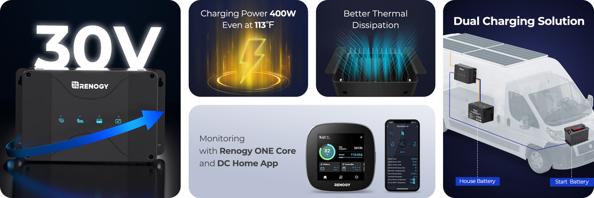Renogy's upgraded DC to DC Dual Input Battery Charger now supports 30V solar input, delivering faster and more efficient charging for your house battery.