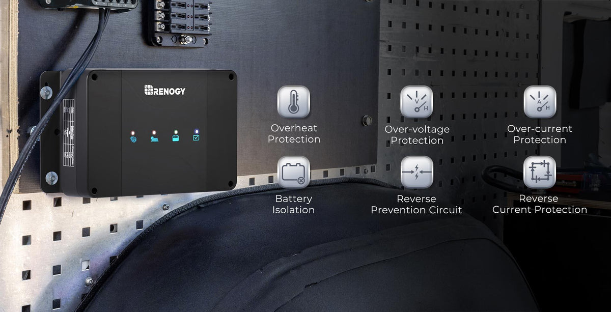 This battery charger features multiple intelligent protections for batteries, solar panels, and the alternator, safeguarding your system and ensuring optimal charging.