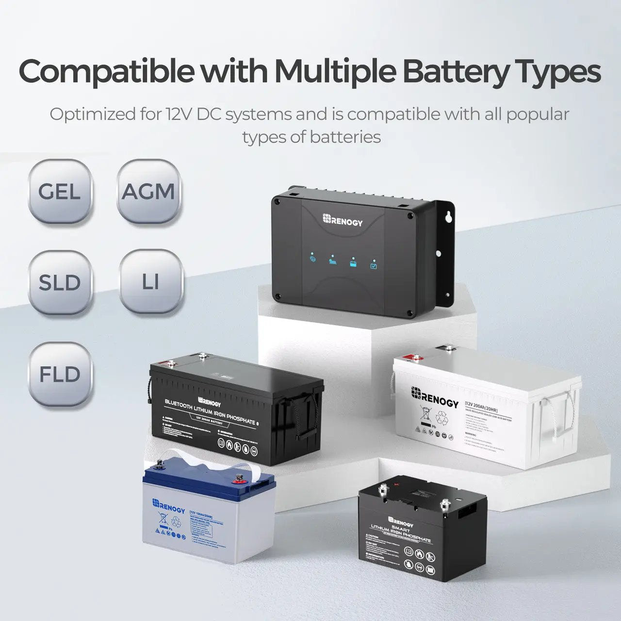Renogy's DC to DC MPPT on-board Battery Charger is designed to give you options! This multi-stage, multi-input battery charger can charge a service battery from a starting battery linked to an alternator or by utilizing solar panels connected directly to the unit. While your vehicle's alternator prioritizes your starting battery, this unit will allow your solar system to charge your service battery first! It's the smart way to keep yourself fully charged and off-grid longer! And with multi-stage charging and multi-chemistry functionality, Renogy's DC to DC MPPT Charger has you covered whether you're using Flooded, Gel, AGM, or Lithium batteries. With RJ45 communication port featured, you can unlock monitoring features exclusively using the BT-2 Bluetooth Module and Renogy DC Home App, control and monitor the device remotely through your phone in real time.