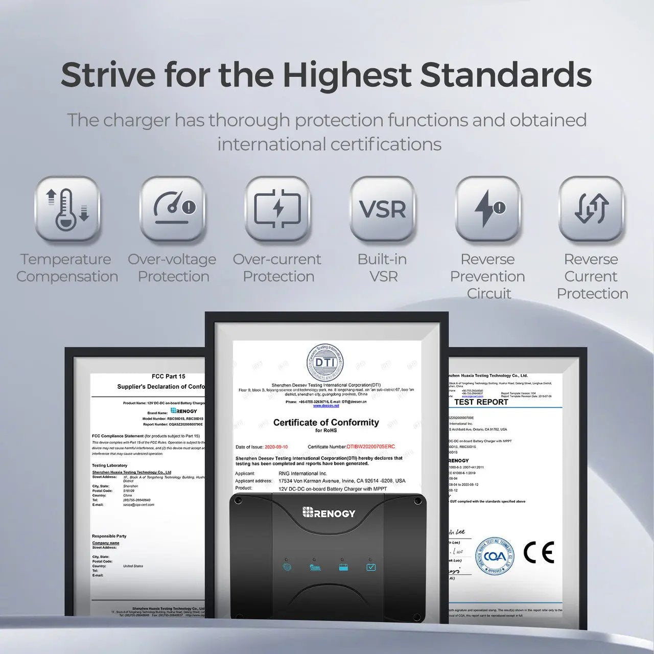 【Comprehensive Security Assurance】 The Renogy DC-DC Battery Charger is multi-certified to CE, FCC, and PoHs. This high-quality battery charger has multiple intelligent protections including battery isolation, over-voltage protection, battery temperature protection, over-current protection, overheat protection, reverse current protection, solar panel and alternator reverse polarity protection, guaranteeing charging safety and protecting your batteries.