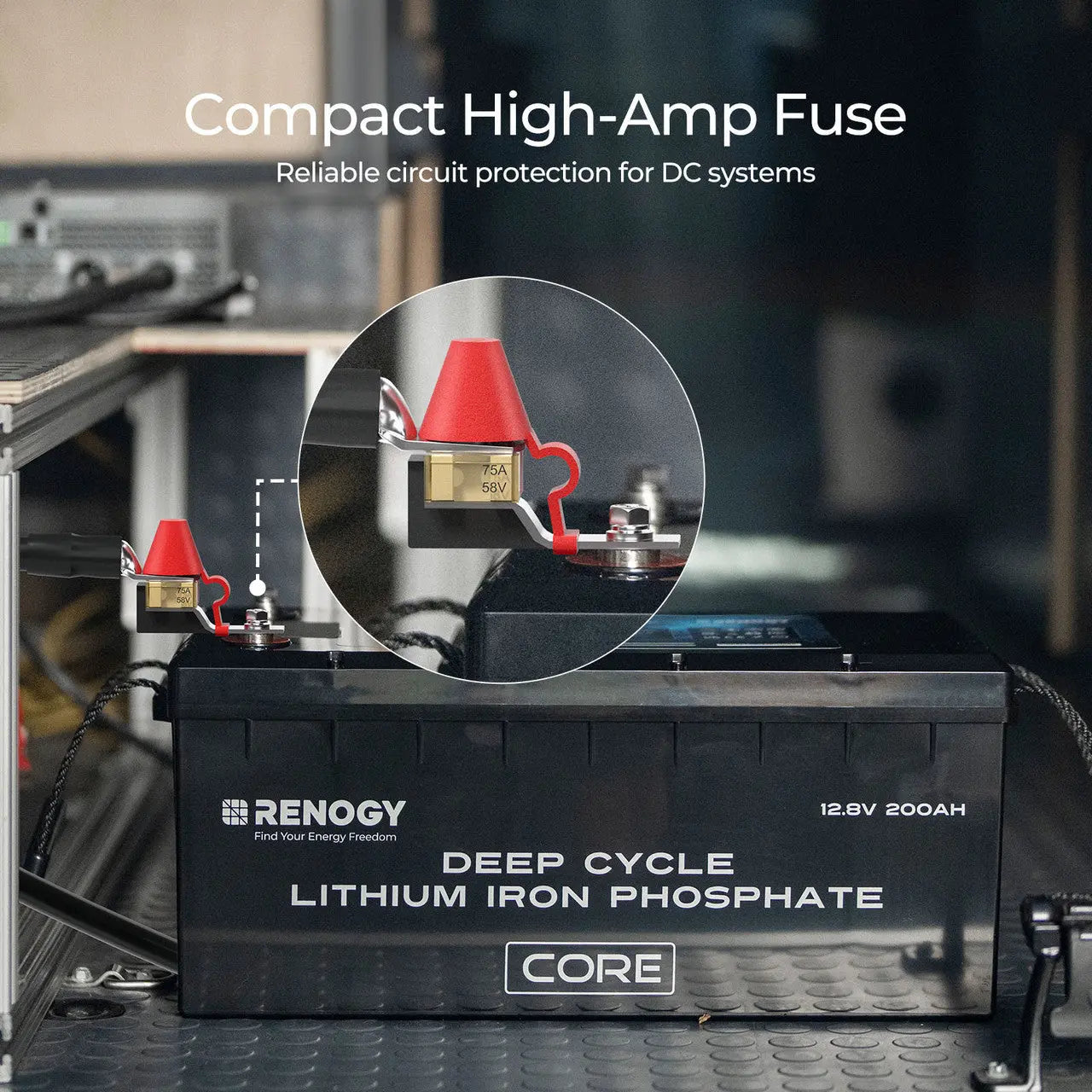 MRBF fuse attaches directly to the positive terminal's copper plate for circuit protection, eliminating the need for external connections.