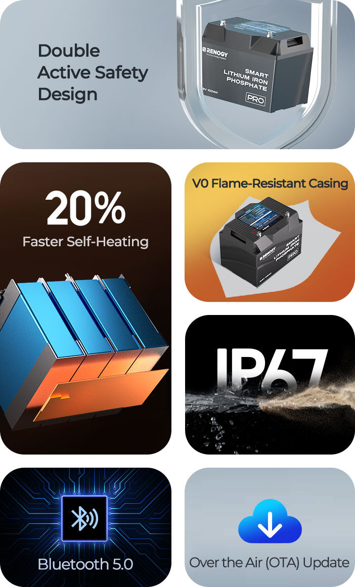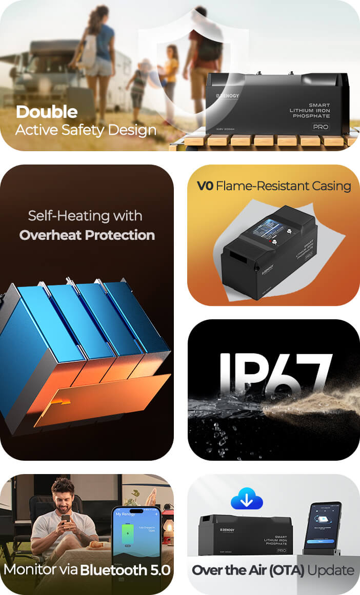 The double active safety system in the 12V 100Ah Pro LiFePO4 Battery combines 60+ Battery Management System (BMS) protections with active backup protection to prevent electrical and other potential hazards, ensuring the safety of both you and your system.