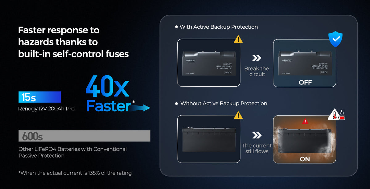 Active backup protection is a new feature in Renogy's deep-cycle LiFePO4 battery, designed to respond quickly to potential risks like overvoltage and overheating. It uses self-control fuses that activate instantly, unlike conventional fuses that take longer, offering fast protection even if other components fail.