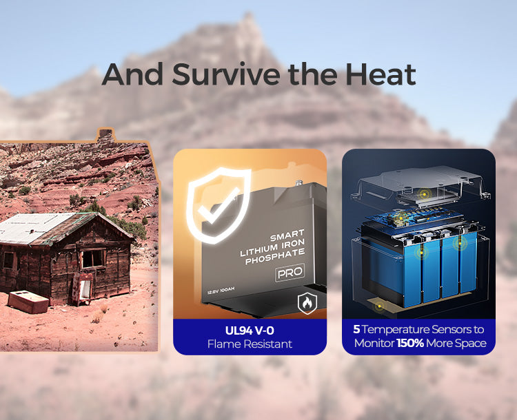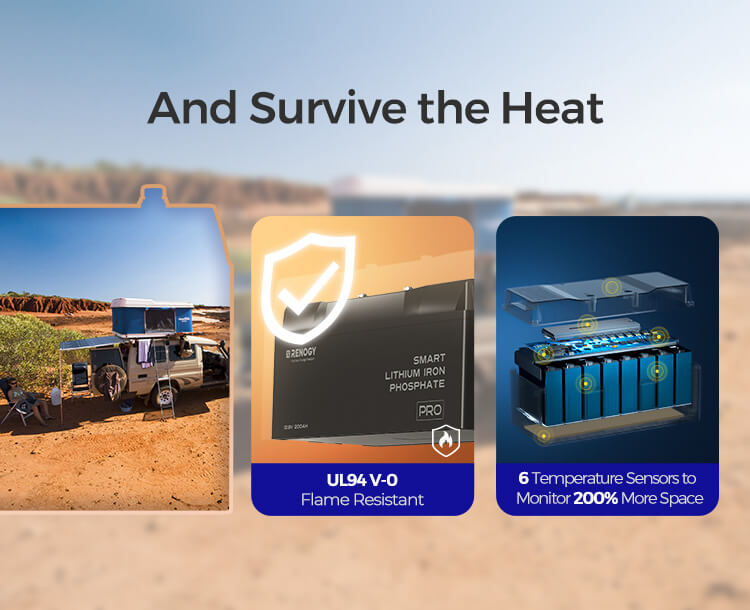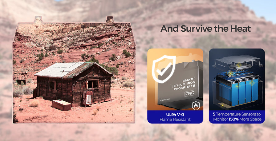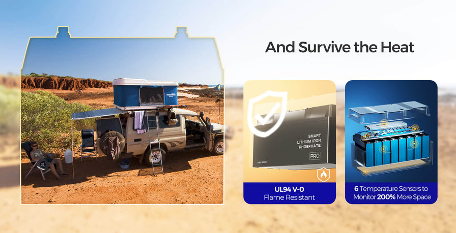 Living in a warmer climate off the grid is made safer than ever with the all-new Pro series lithium battery thanks to the fire-resistant casing (UL94 V-0). It offers outstanding fire resistance to vertical burning, a crucial safety feature to safeguard your power supply against fire hazards and reduce the risks of fire spreading, especially when living in remote areas where emergency response can be delayed.