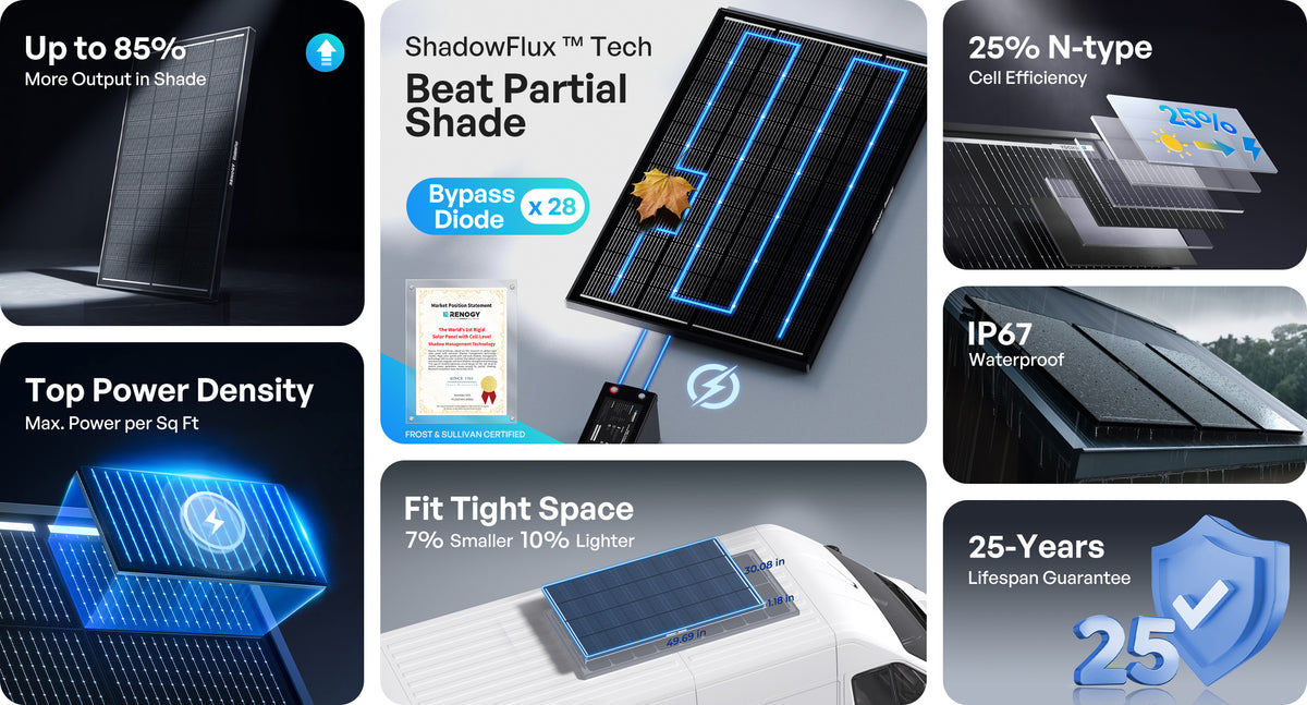 ShadowFlux features a high open-circuit voltage (36.5V) and is compatible with both 12V and 24V battery systems.