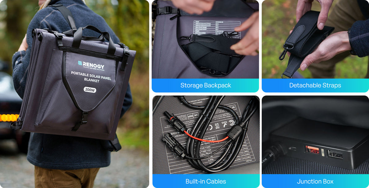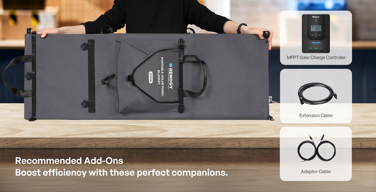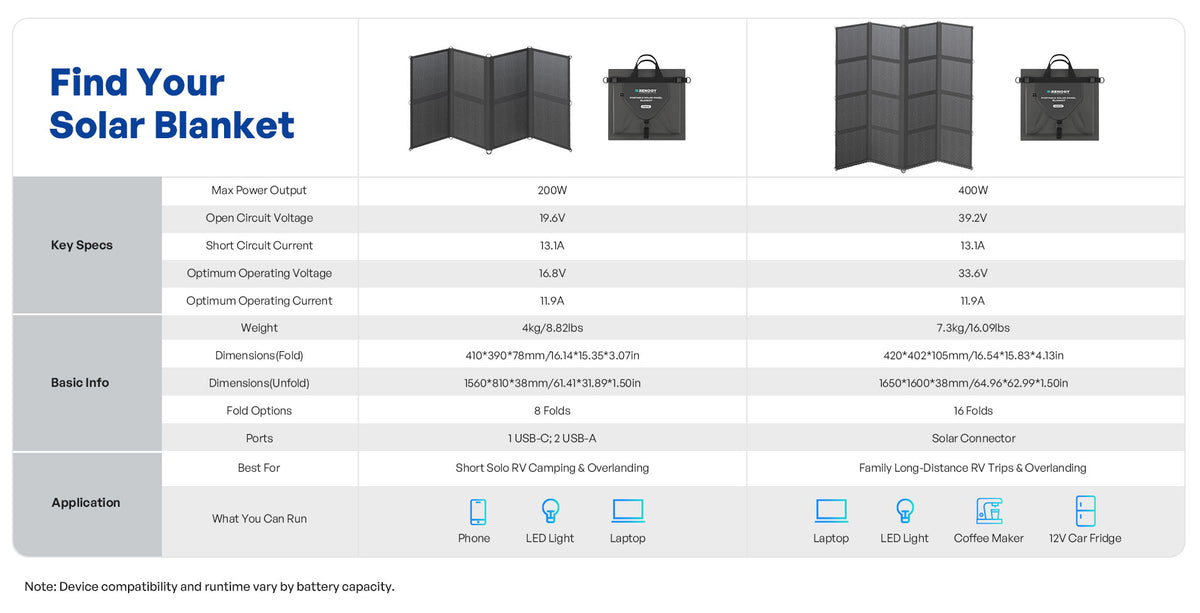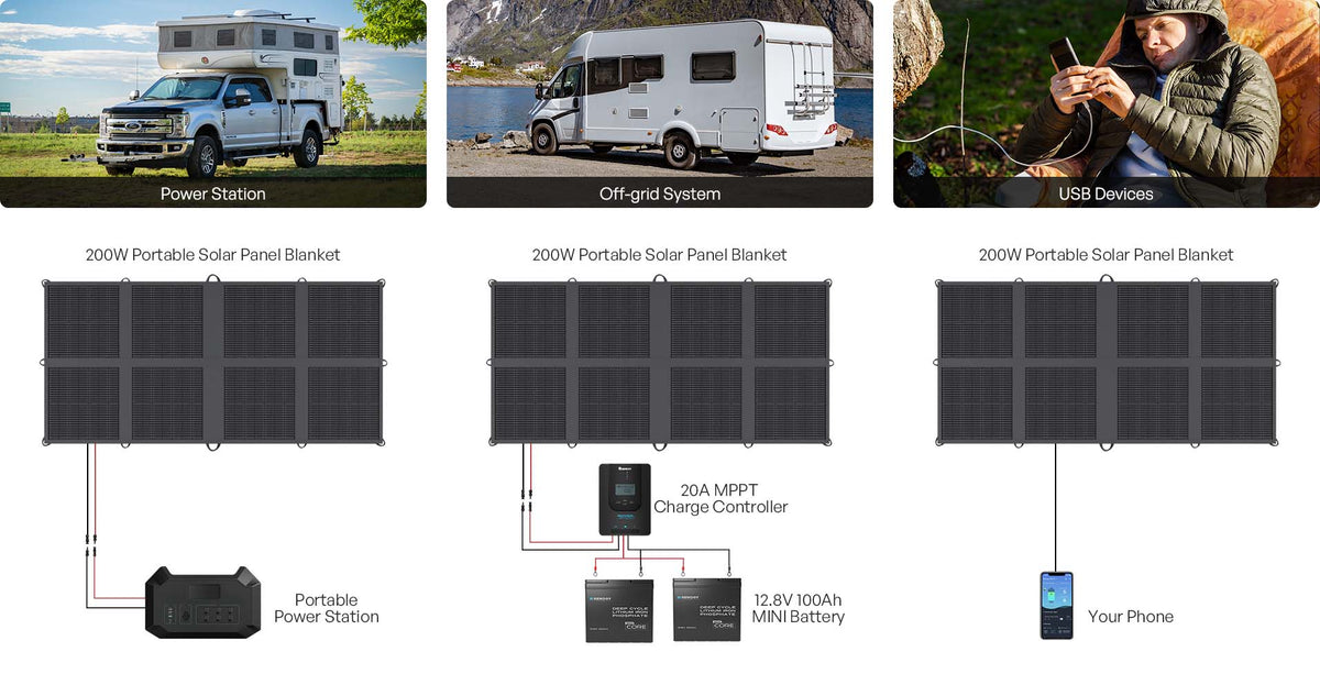200/400W solar panel blanket can charge batteries (solar charge controllers are required) and portable power stations. Ensure the open-circuit voltage of the solar panel does not exceed the maximum DC input voltage of any connected power station or solar charge controller.