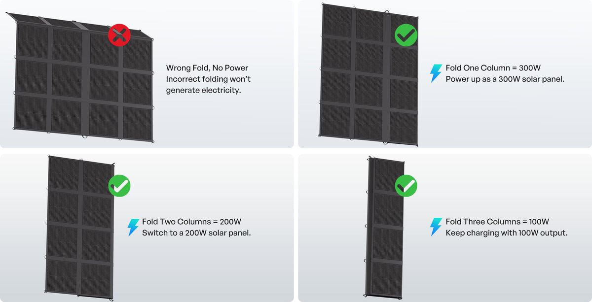 Set your power level to 300W, 200W, or 100W — delivering full performance even when you can’t fully unfold it.