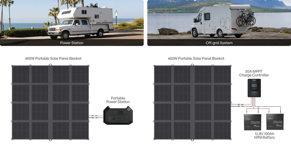 400W solar panel blanket can be connected in series or parallel configuration or array. How you choose to connect multiple solar panels depends both on the size of your off-grid solar system and your power needs.